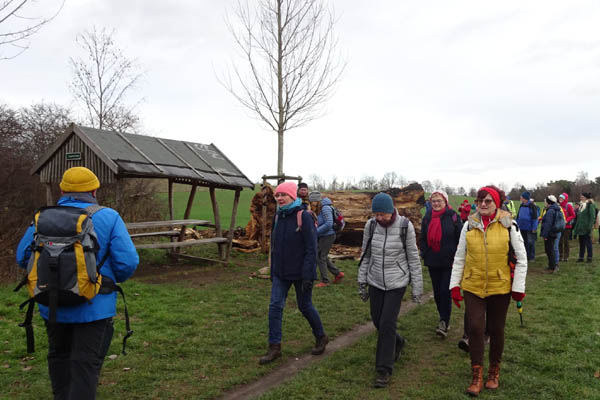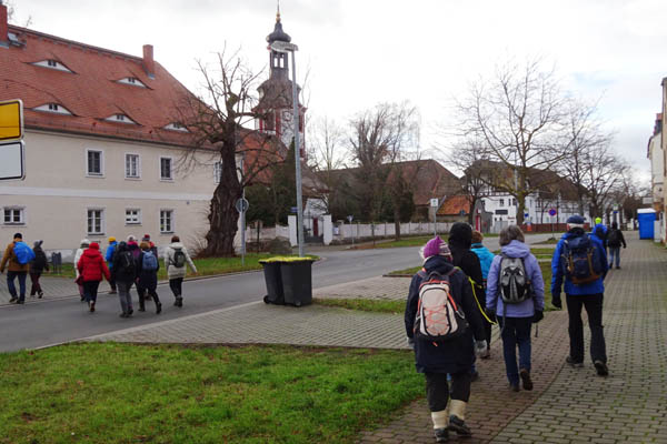 Am Dorfteich Seegeritz ist große Zwischenrast, Rucksackproviant wird verspeist, Schluckflaschen machen die Runde, dazu erfährt die Neujahrshymne Opus-Hopfenberg NR 1 ihre Erstaufführung. Weiter durch die Ortslage zum Kirchberg mit der turmlosen Katharinen Kirche.