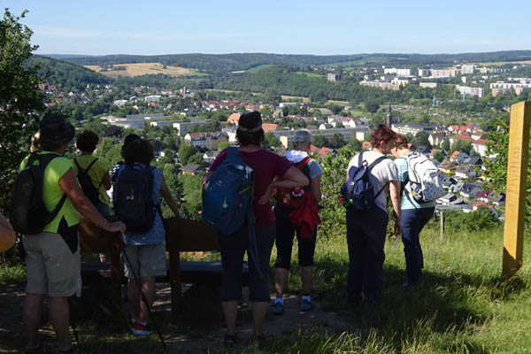 Die frisch gemähte Wiesenaue abwärts, dann auf schmalem Steig nach oben zur Hütte Am Wipsenberg. Bei Liebschwitz verabschieden wir die Teilnehmer der Kurzstrecke, wir Sieben nehmen den Feldweg von der Wehrkirche Taubenpreskeln runter nach Gera Zwötzen. Den Zug knapp verpasst, drücken wir die Zeit im REWE-Café ab, auf wundersame Weise sogar mit unseren Kurzstrecklern.