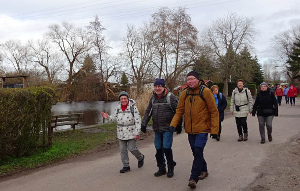Am Dorfteich Seegeritz ist große Zwischenrast, Rucksackproviant wird verspeist, Schluckflaschen machen die Runde, dazu erfährt die Neujahrshymne Opus-Hopfenberg NR 1 ihre Erstaufführung. Weiter durch die Ortslage zum Kirchberg mit der turmlosen Katharinen Kirche.