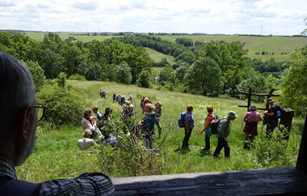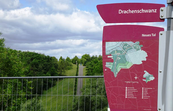Am ehemaligen Festgelände Ronneburg sehen wir den wogenden Weg über die Drachenschwanzbrücke vom Entdeckerturm aus, nach der Treppenkaskade geht es am Badergraben drunter durch zur Pumpstation am Gessenbach. Brunnenschächte säumen den asphaltierten Weg, dienen der Wasserhaltung im Gessental. Am Rastplatz „Seydel-Eisel-Stein“ informieren Infotafeln übers Grenzstein-Lapidarium in Collis, aus dem Erbe der Kleinstaaterei. Collis, der westlich gelegene Stadtteil von Gera liegt eingebettet im Gessenbach- Bogen mit „Cafe-Gasthaus & Pension“. Man garantiert mit Köstritzer Bier das „Ende der Durststrecke“. Am letzten Haus führt der Lutherweg als Steilpfad hoch zur Schutzhütte mit Talblick. Kurz verschnauft dann über die Colliser Alpen zum belebten Stadtring-Süd-Ost. Den queren wir an der Ampel nach Zschippern.